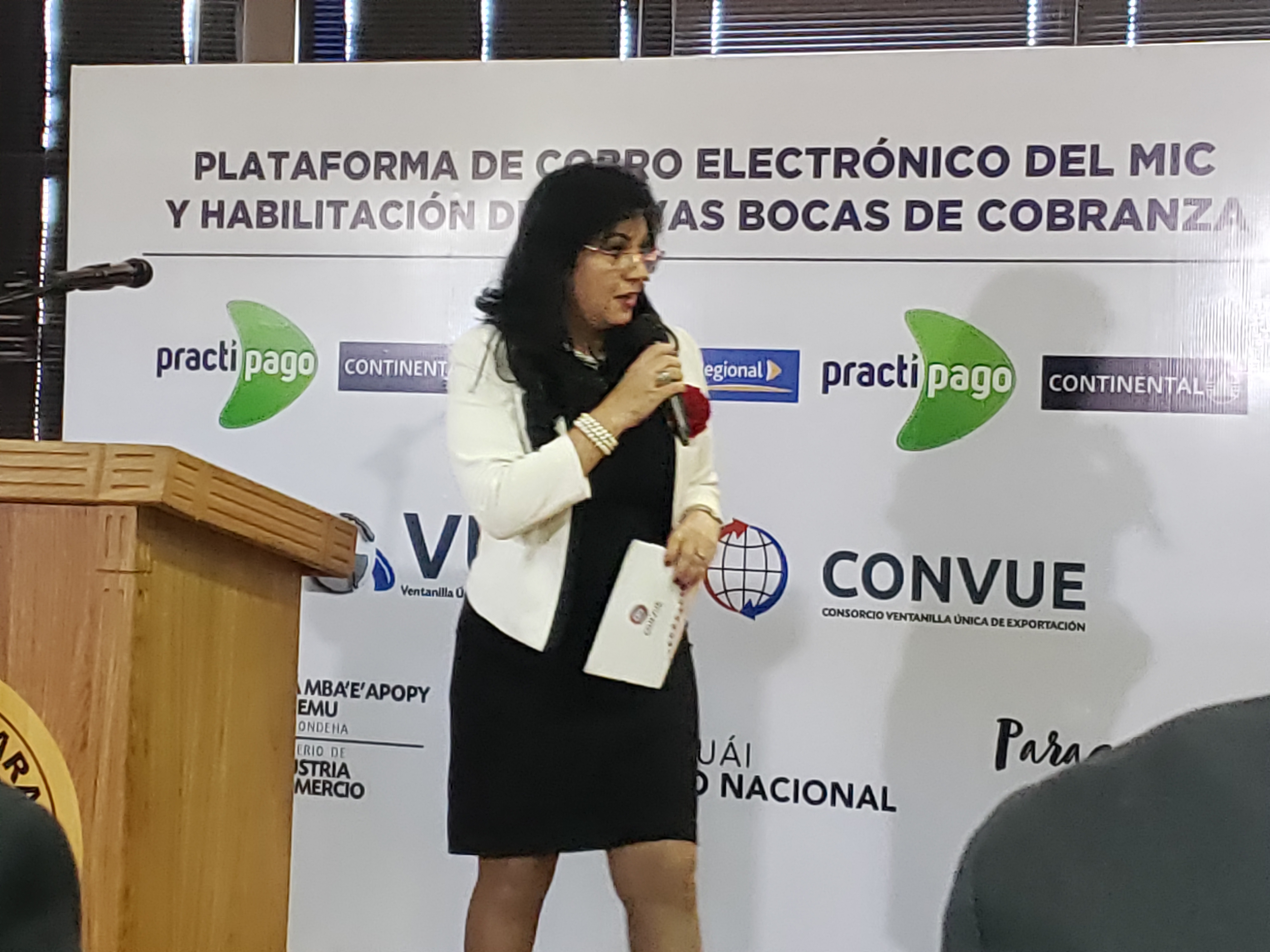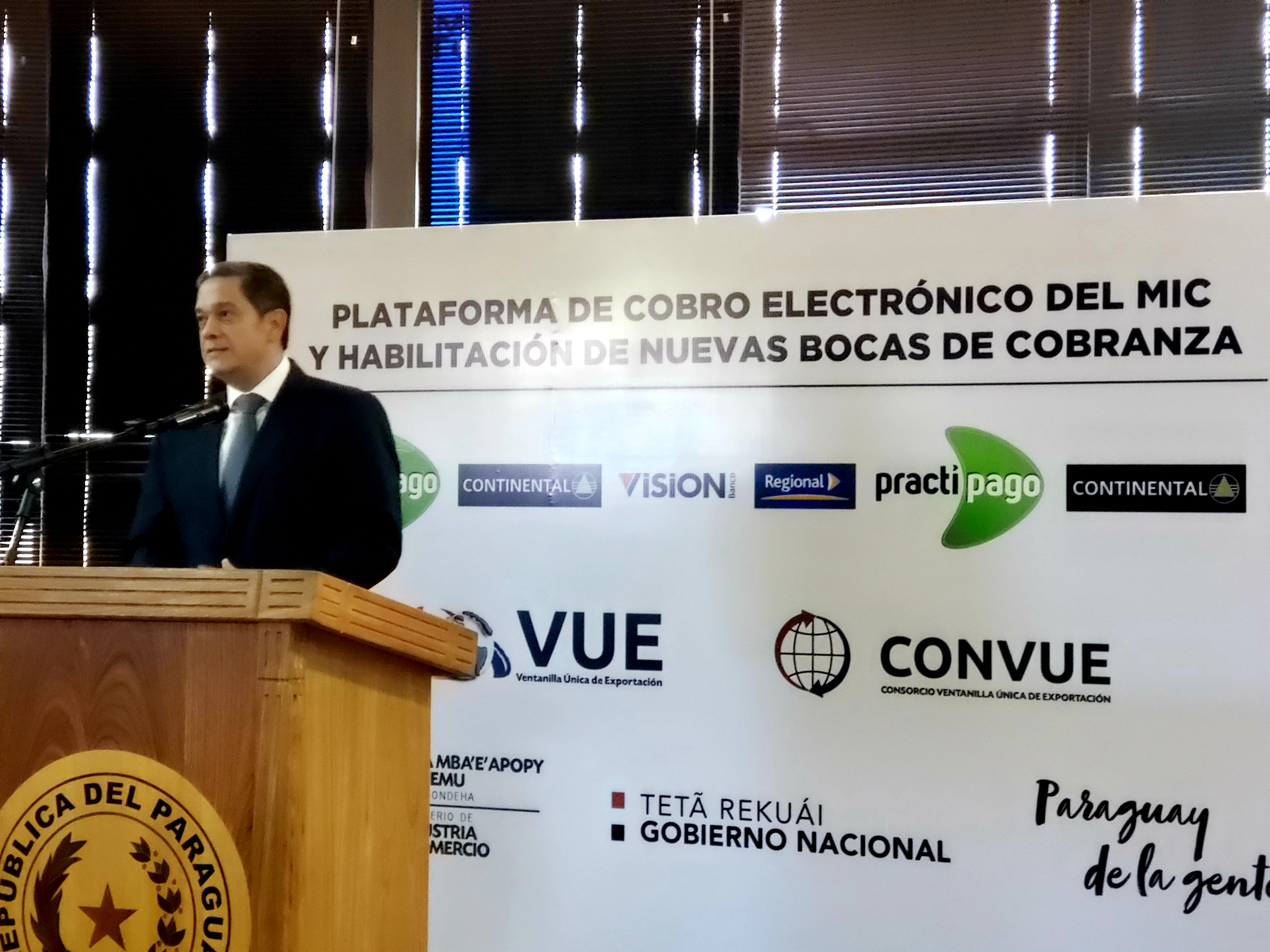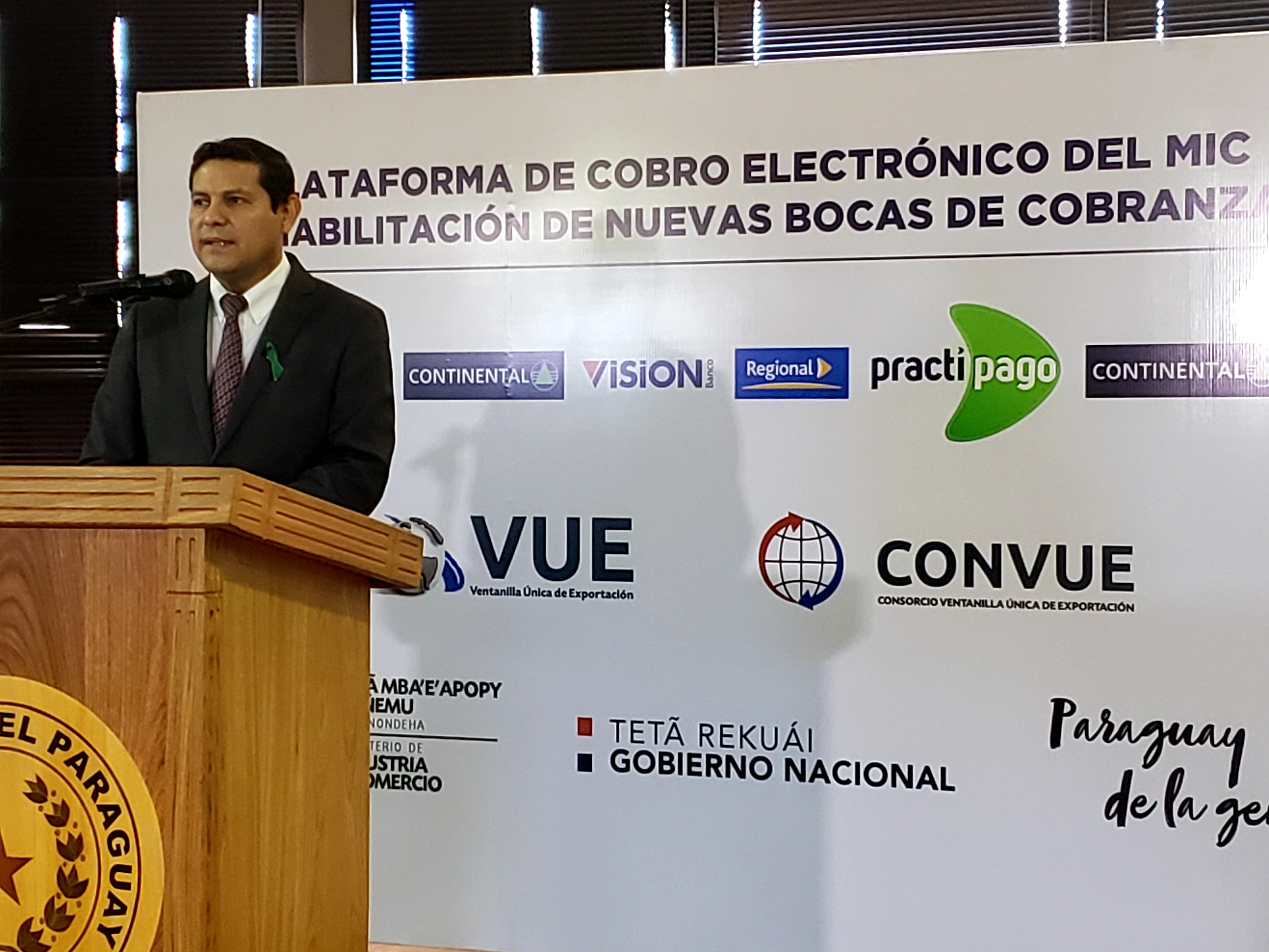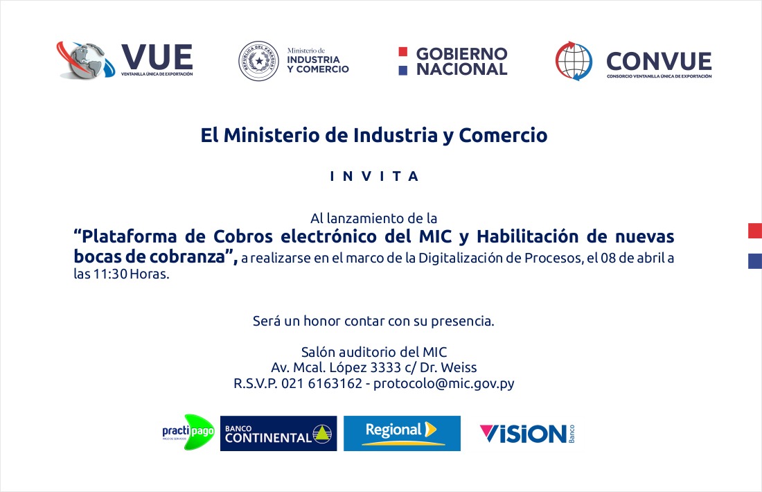 El Ministerio de Industria y Comercio (MIC), a través de la Ventanilla Única de Exportación (VUE) y del Consorcio Ventanilla Única de Exportación (CONVUE), presentan la “Plataforma de Cobro Electrónico del MIC y Habilitación de nuevas bocas de cobranza”, a realizarse en el contexto de la digitalización de los procesos, que lleva adelante la institución ministerial. Se trata de un sistema de pago cuyas ventajas radican en que: el 100 % del proceso de pago se podrá realizar desde el hogar u oficina, con el único requisito de tener un equipo con acceso a internet, un explorador y una cuenta corriente y/o caja de ahorro, en uno de los bancos habilitados; con este sistema se elimina totalmente la necesidad de acudir a la institución (MIC) ya que el ticket que otorga la entidad bancaria está habilitado como comprobante fiscal por el Ministerio de Hacienda; otra de las ventajas es el horario, las 24 horas de los 7 días de la semana para los pagos, en el caso de contar con cuenta corriente en algunos de los bancos (Home Banking) y un horario extendido en caso de utilizar los cajeros; y finalmente, habrá múltiples opciones para el pago, muy importante en caso, que alguno de ellos falle.