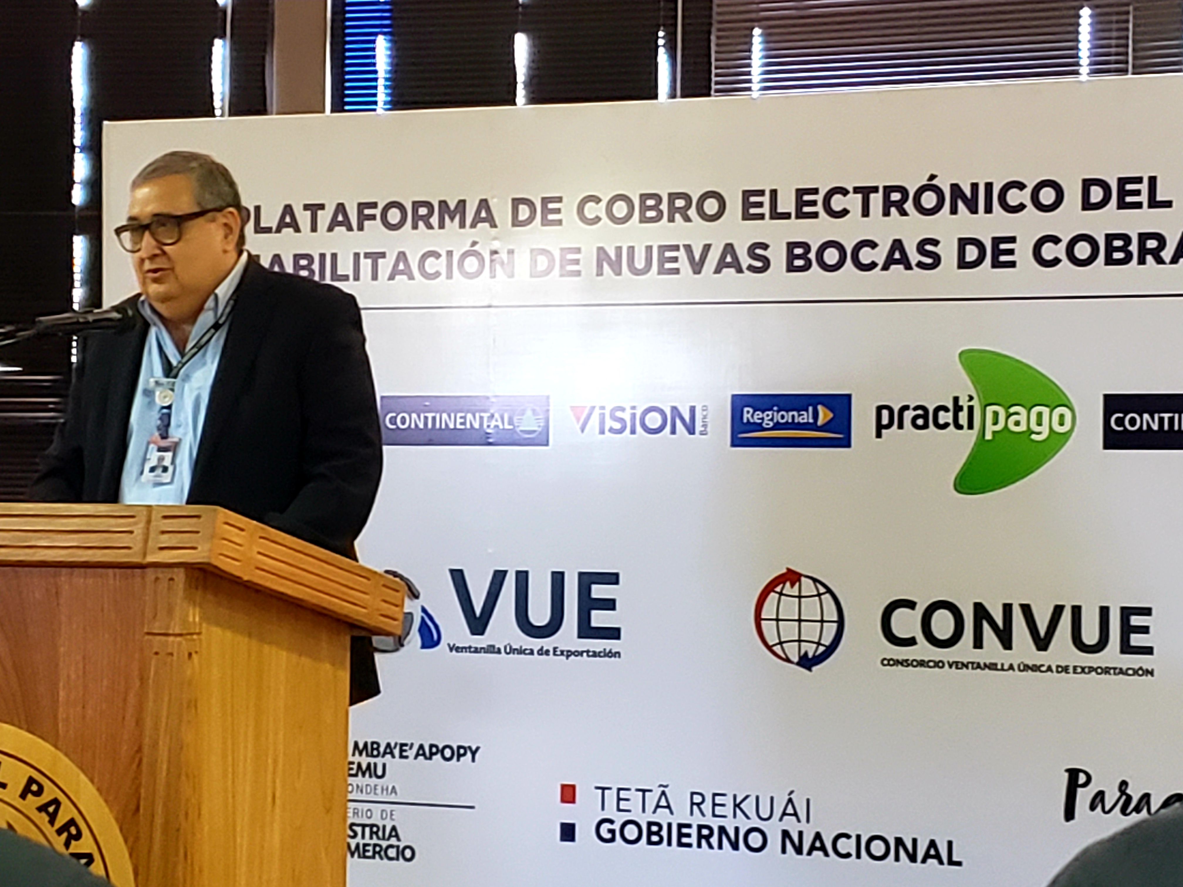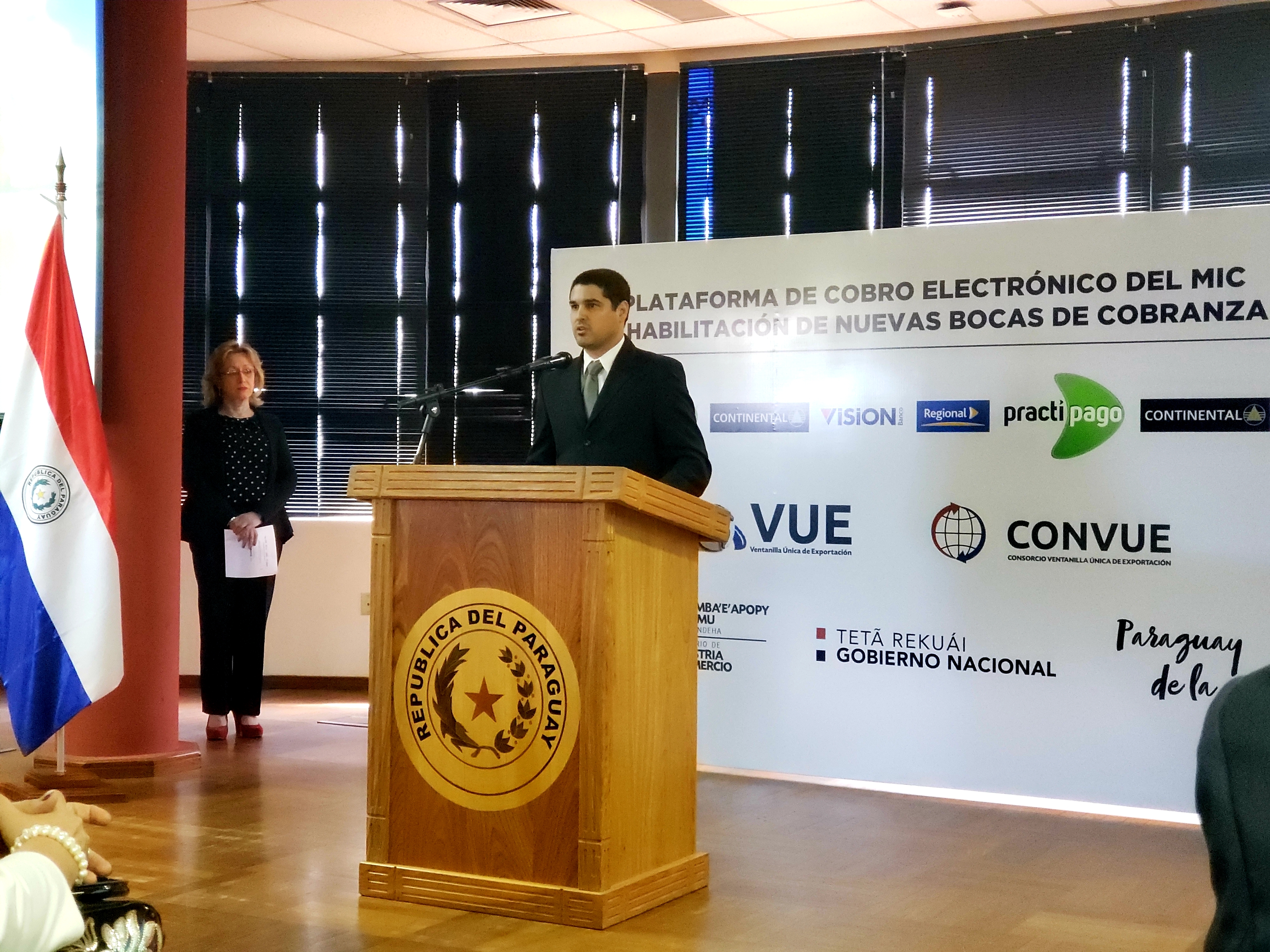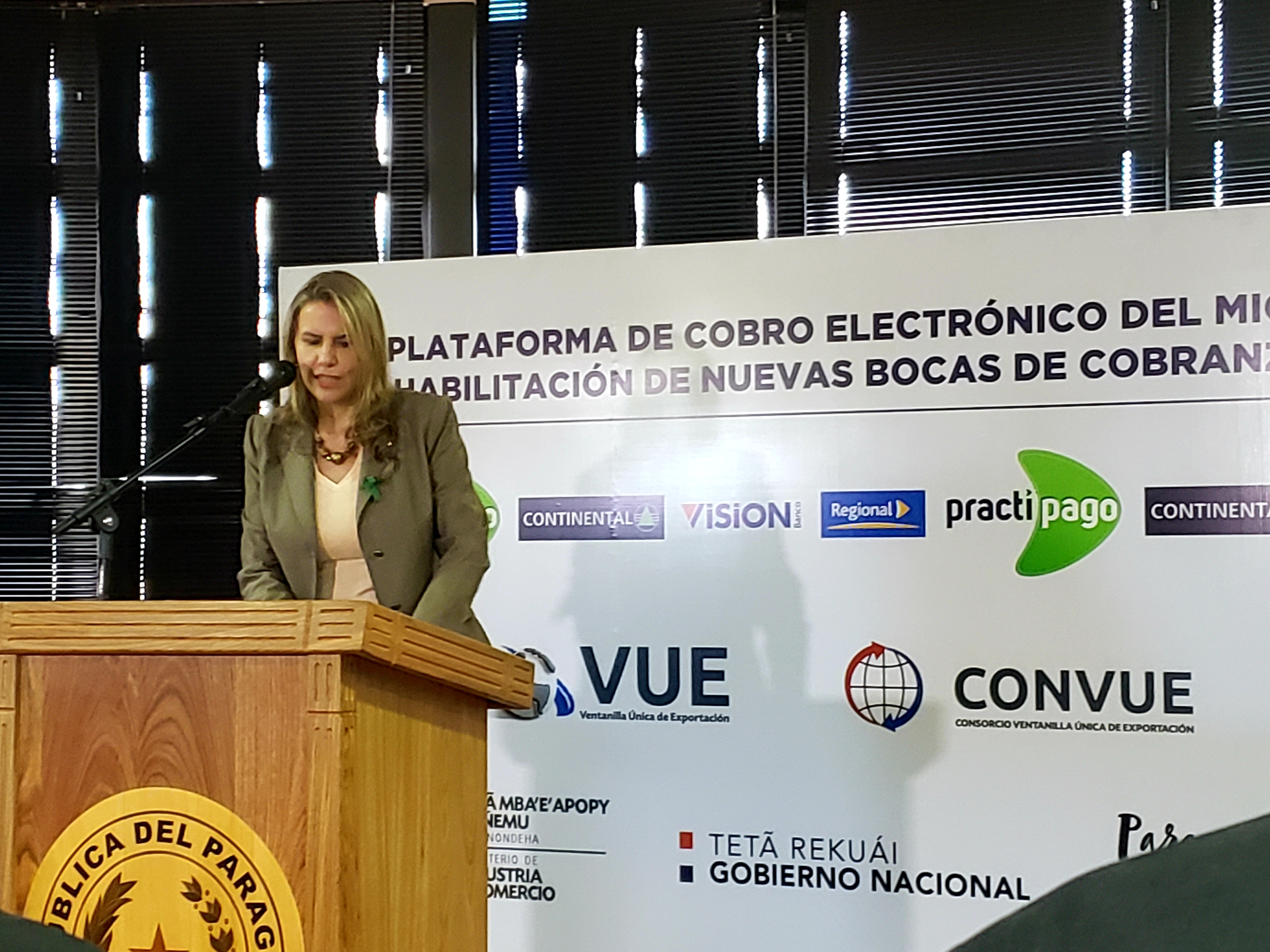 El Ministerio de Industria y Comercio (MIC), a través de la Ventanilla Única de Exportación (VUE) y del Consorcio Ventanilla Única de Exportación (CONVUE), presentan la “Plataforma de Cobro Electrónico del MIC y Habilitación de nuevas bocas de cobranza”, a realizarse en el contexto de la digitalización de los procesos, que lleva adelante la institución ministerial. Se trata de un sistema de pago cuyas ventajas radican en que: el 100 % del proceso de pago se podrá realizar desde el hogar u oficina, con el único requisito de tener un equipo con acceso a internet, un explorador y una cuenta corriente y/o caja de ahorro, en uno de los bancos habilitados; con este sistema se elimina totalmente la necesidad de acudir a la institución (MIC) ya que el ticket que otorga la entidad bancaria está habilitado como comprobante fiscal por el Ministerio de Hacienda; otra de las ventajas es el horario, las 24 horas de los 7 días de la semana para los pagos, en el caso de contar con cuenta corriente en algunos de los bancos (Home Banking) y un horario extendido en caso de utilizar los cajeros; y finalmente, habrá múltiples opciones para el pago, muy importante en caso, que alguno de ellos falle.